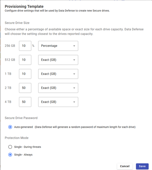 Templates allow administrators to select the desired Secure Drive protection mode: