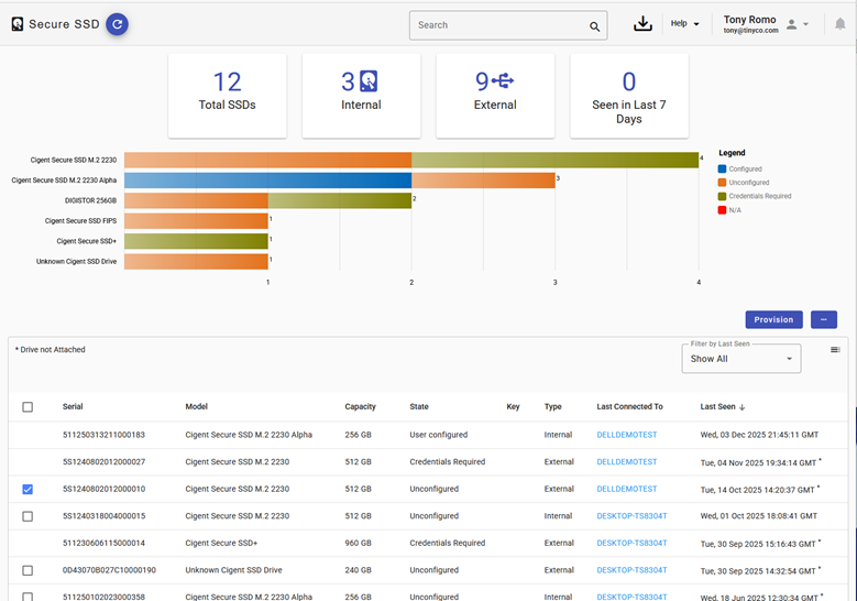 The Secure SSD page provides administrators with centralized visibility and management of Cigent Secure SSDs detected on Data Defense managed endpoints. This page supports both inventory reporting and remote provisioning of secure drives on compatible SSD hardware.